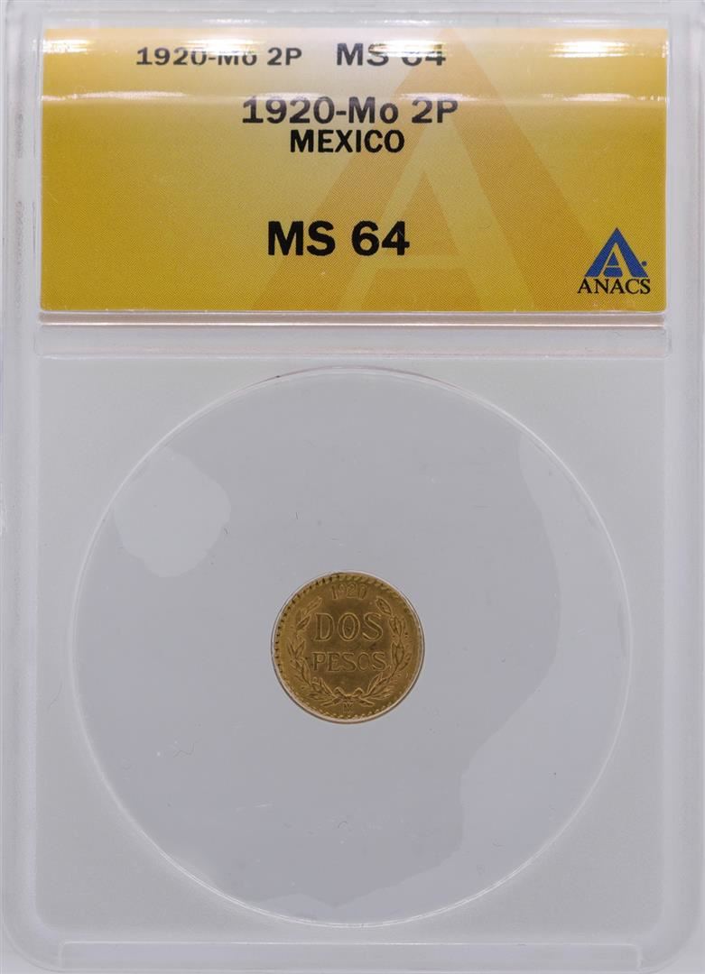 One 1920MO Mexico 2 Pesos Gold Coin ANACS MS64. ANACS Certified.