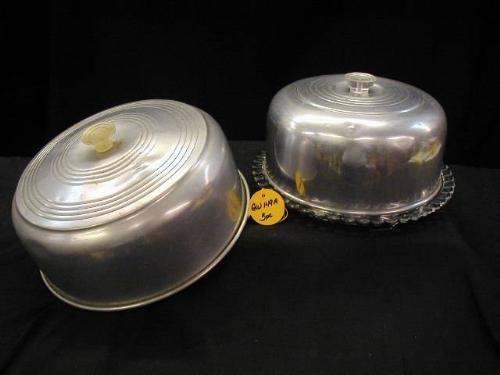 1920'S CAKE PLATE 11 3/8inDEPRESSION PLATE FOOTED W/ (2) ALUM. DOMES (1) 9 7/8inDAI (1) 11 5/8inDIA, 3 PC