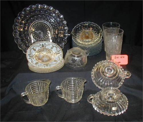 1920'S DEPRESSION GLASS INCLUDES (1) 10' BUBBLE PLATE, (8) BUBBLE SAUCERS W/ BLUE TINGE, (4) HERITAGE CLEAR SAUCERS, (1) CUP, (2) WATER TUMBLERS SANDWICH GLASS 9 OZ., PR. SINGLE CANDLE HOLDER MANHATTAN LIKE, (2) CREAMERS MANHATTAN LIKE, 20 PCS
