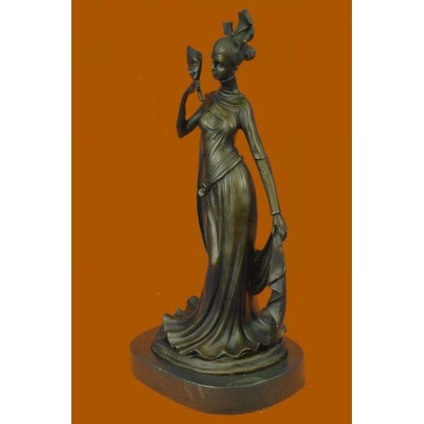 This unique sculpture of a 1920's woman is a beautiful piece for an exquisite living room or a young lady's bedroom. As she stands elegantly for her photo-shoot, who can forget to mention her unforgettable dress that drops all the way to the floor, while she holds a mask on her right hand. The details on her dress , are unbelievably carved leaving her picture perfected. This is a beautiful bronze sculpture cast using the Lost Wax Method and has a gorgeous brown patina. It is mounted on a marble base. Bronze Dimensions with Marble Base: Height 14 X Width 7 inches. Weight: 9 LBS. Please Note: This is a reproduction bronze sculpture from the original molded and signed. This featured bronze sculpture is a recast after the original, and has been done recently. This 100% bronze sculpture is an abstract piece certain to be a conversation piece.Please Note: This is a reproduction bronze sculpture from the original molded and signed. This featured bronze sculpture is a recast after the original, and has been done recently. This 100% bronze sculpture is an abstract piece certain to be a conversation piece.