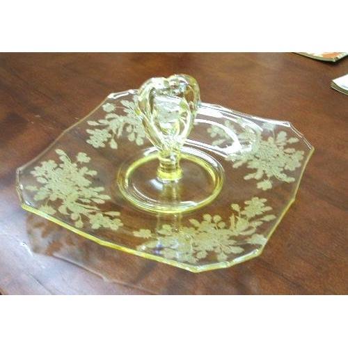 This is a very hard piece to find. It was made by Paden City Glass Co. in the 1920s. It is called Ardith with the cherry blossom etching. It is a yellow 10" fancy handled sandwich tray with the cherry blossom etching. This is to the best of my knowledge and my depression glass book. It is a beautiful piece and in absoluetly excellent condition. I have never seen or had this piece before and according to my research online nobody else has either, at least not at the moment.