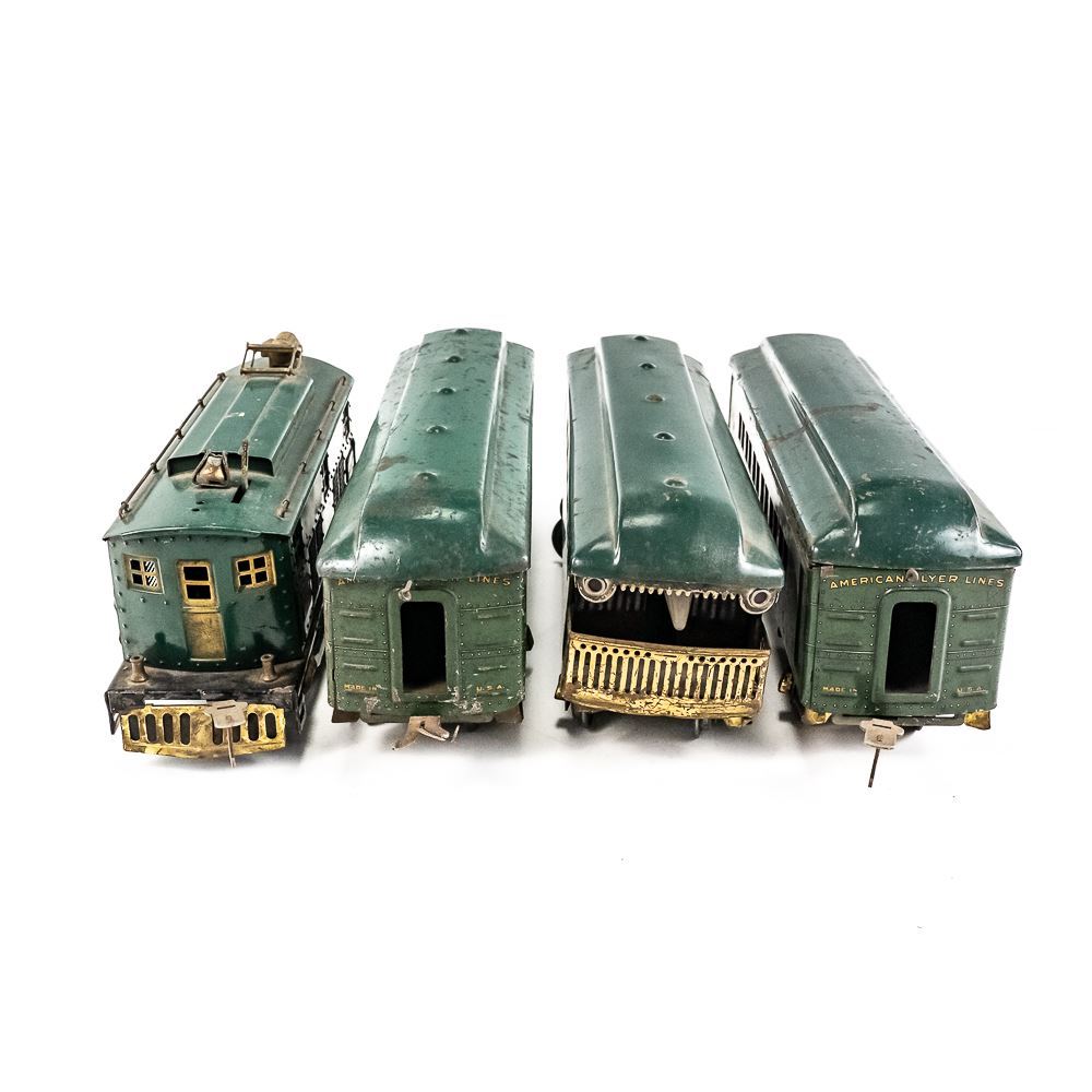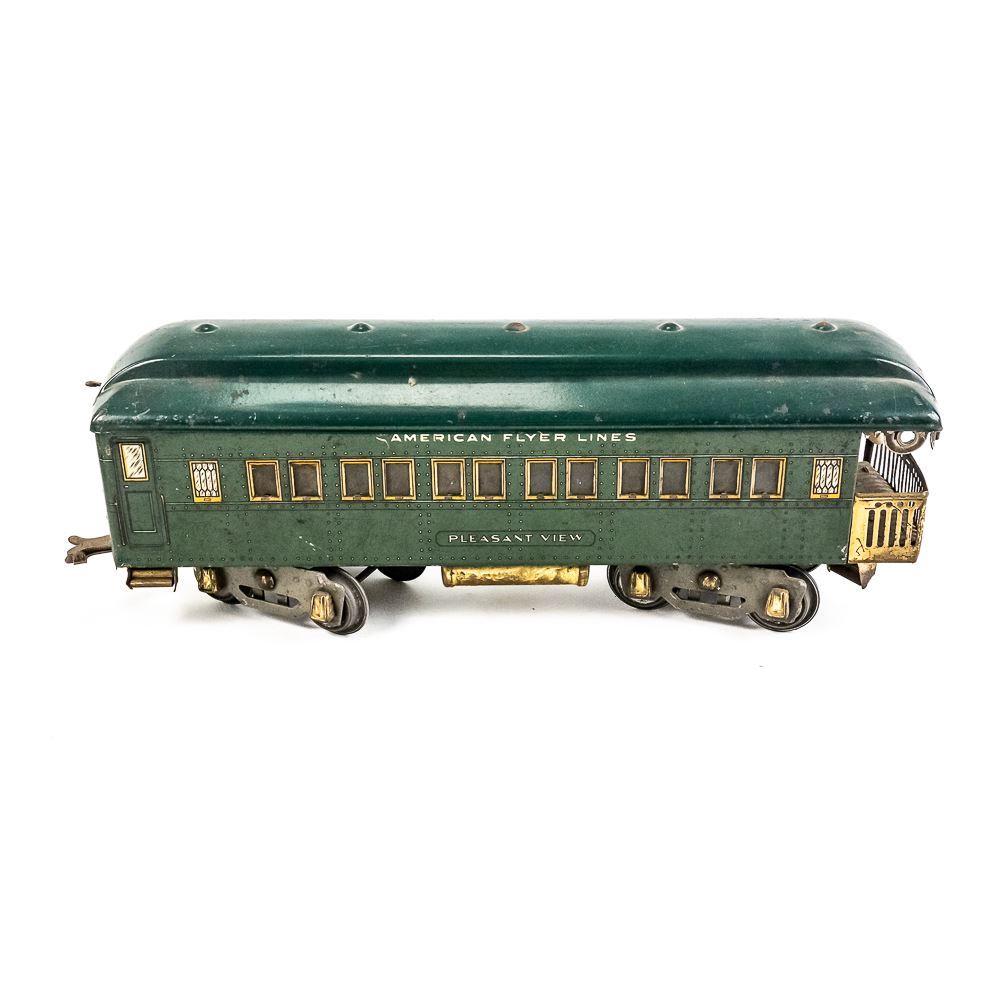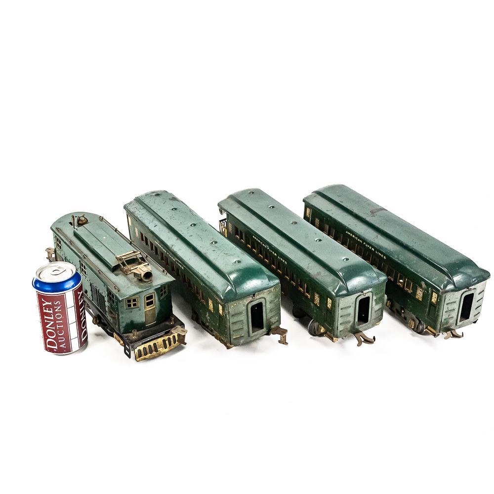 1920s standard gauge American Flyer 4644 engine with America, Pleasant View & America matching railway cars. Good overall condition with age and wear including minor discoloration, paint loss, oxidation, scuffs & scratches. Perfect addition to your collection, please use photos to judge condition and bid accordingly.