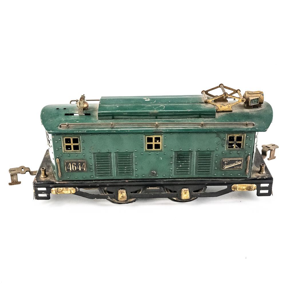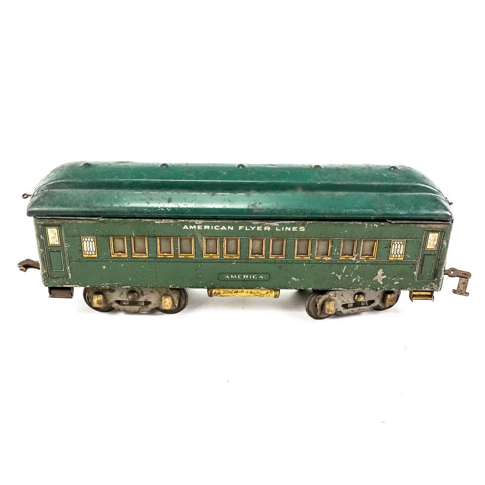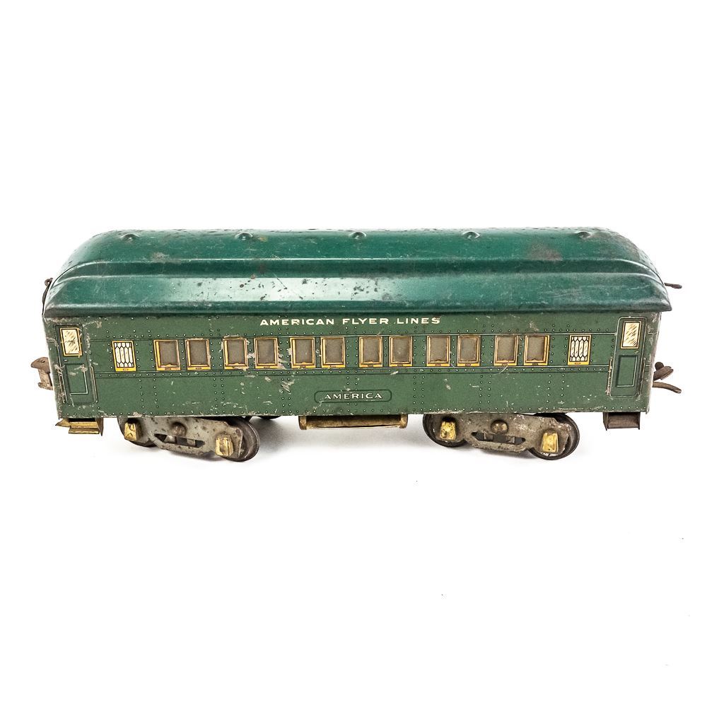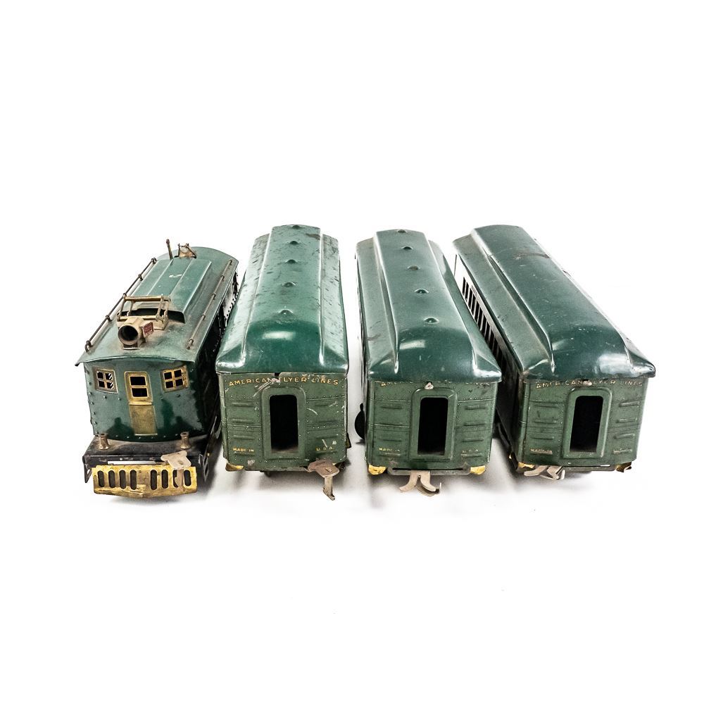 1920s standard gauge American Flyer 4644 engine with America, Pleasant View & America matching railway cars. Good overall condition with age and wear including minor discoloration, paint loss, oxidation, scuffs & scratches. Perfect addition to your collection, please use photos to judge condition and bid accordingly.