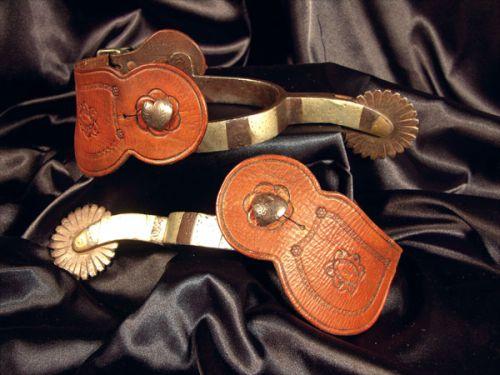 1920s Blacksmith made Spurs, nickel and copper, heart shape button, large rowels, unmarked. Tooled leathers by Mario Hanel Stayton, OR. Good condition.