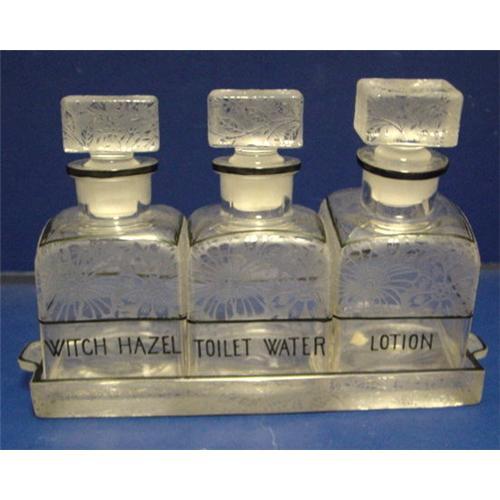 This Gorgeous set consists of 3 Bottles and a matching tray. The Bottles are divided in two, the top has a beautiful flower etched designs with black rim, and the bottom has the words WITCH HAZEL - TOILET WATER - LOTION, these words are in black enamel. The Tray and the Stoppers have the same pattern as the bottles. There is 4 pieces in all, 3 bottles and 1 tray.
