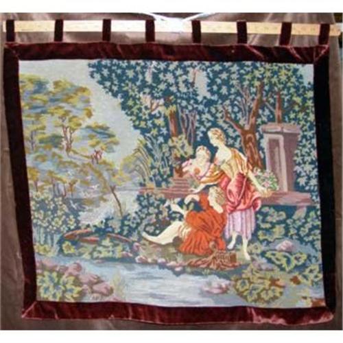 1920s French Needlepoint tapestry depicting classical scenes of a man and 2 women in a garden picking flowers. Bordered in burgundy velvet and lined. Hand made with beautiful rich colors.