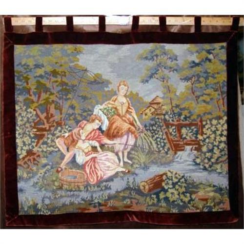 1920s French Needlepoint tapestry depicting classical scenes of a man and 2 women fishing. Bordered in burgundy velvet and lined. Hand made with beautiful rich colors.