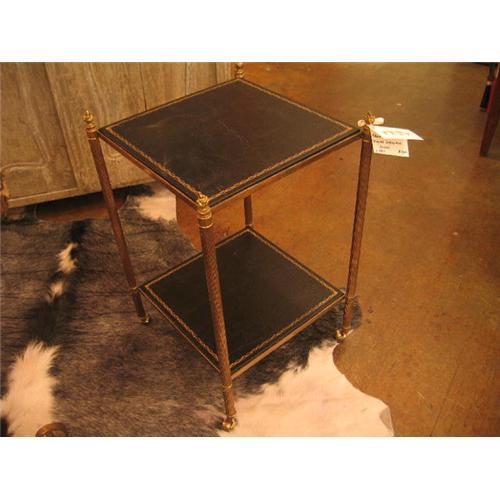 Stylish 1920s French two-tiered side table with original castors, finials, and embossed vinyl. From Nice.