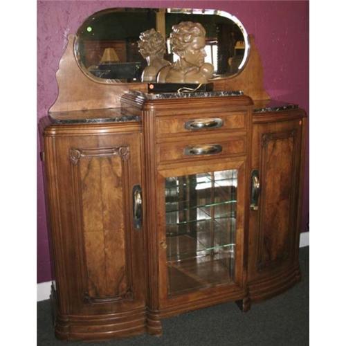 French Walnut Art Deco Dessert. Keys are included and locks are in working condition. Marble on left side has been professionally repaired. This repair is noticeable to the touch, but not to the eye. However, this does not affect the beauty or utility of the piece. Please refer to photos or contact us for further information.