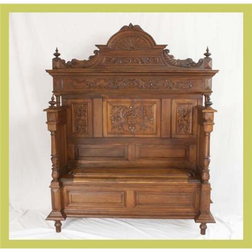 French Walnut Henry II Bench. Bench is newly constructed using the headboard, footboard and siderails of an antique bed. A separation in the wood of the headboard has been professionally repaired and is barely noticeable to the eye, but this repair does not affect the beauty or utility of the piece. Please refer to photos or contact us for further information.