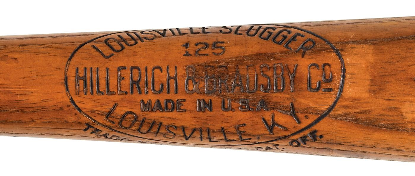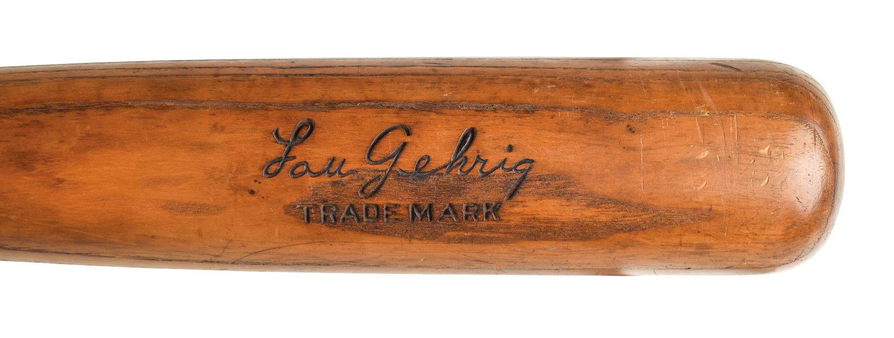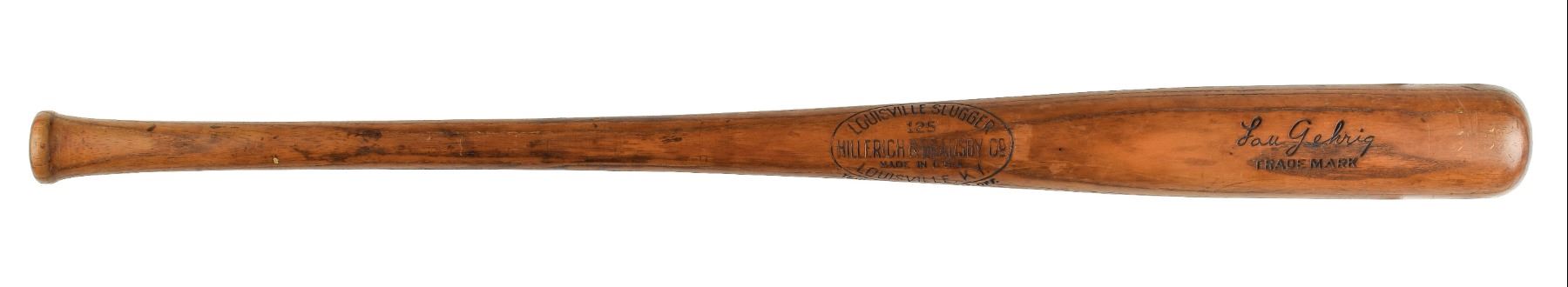 One of the greatest hitters of all time was well represented at the local sporting goods stores, with all the kids wanting to 'hit the ball like' Gehrig. And what better way to accomplish the sandlot league Triple Crown than by swinging a Gehrig bat. This 33-inch, 31 oz. Louisville Slugger 125 signature model looks like the real McCoy with the same highest quality wood as the professional bats, but with different dimensions than what 'The Iron Horse' would have used. A few light nicks here and there, but this bat contains a deeply burned label and name on the barrel. About Excellent condition.