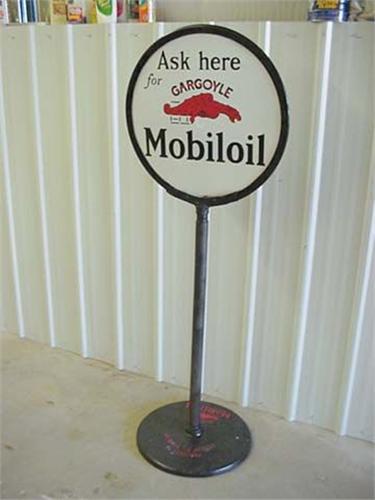 1920's Mobil Oil gargoyle curb sign on original embossed base. 24" diameter.