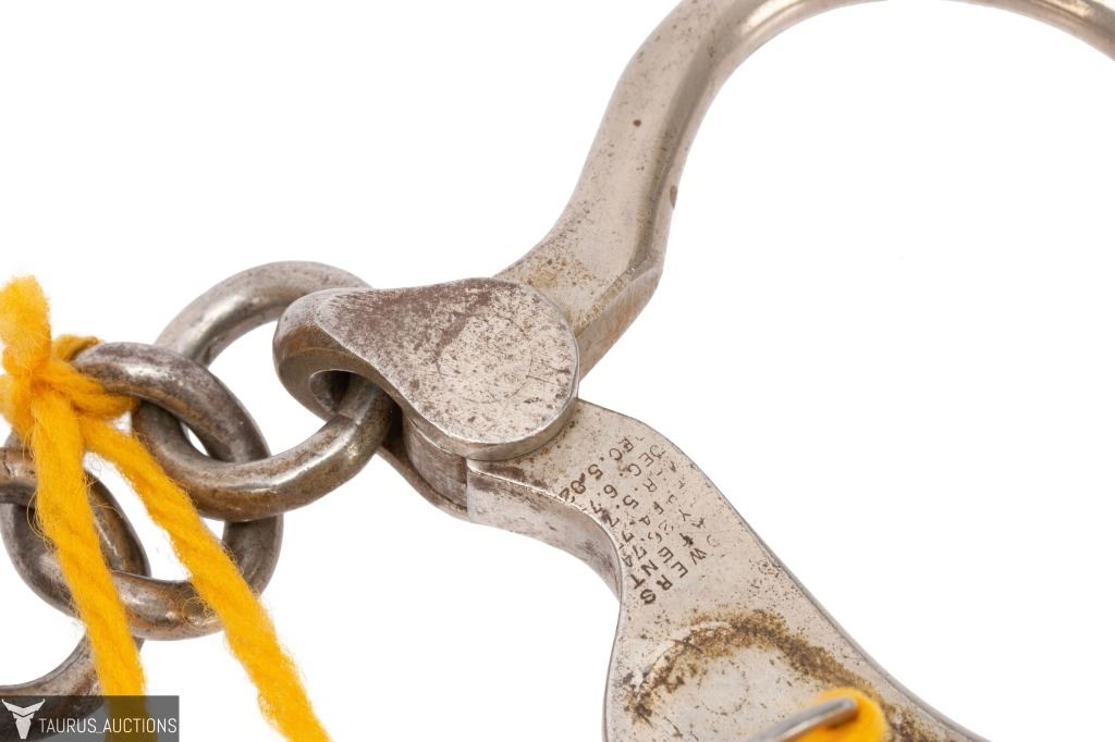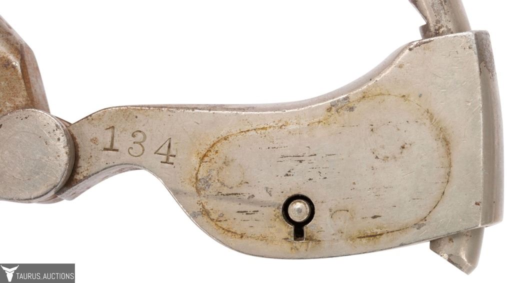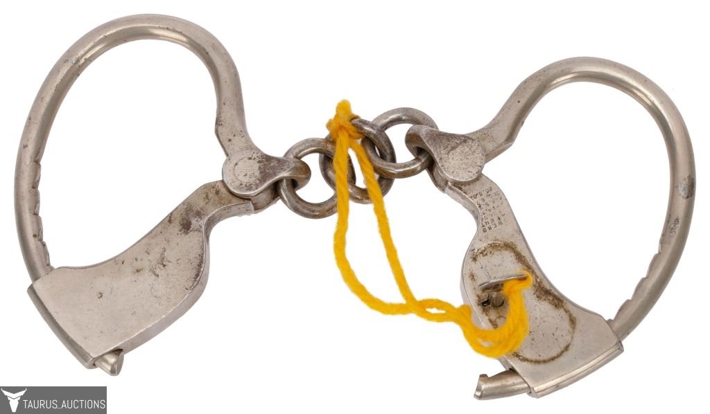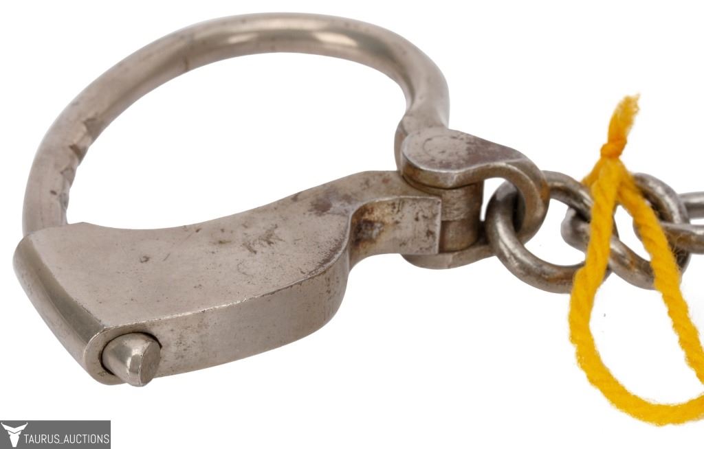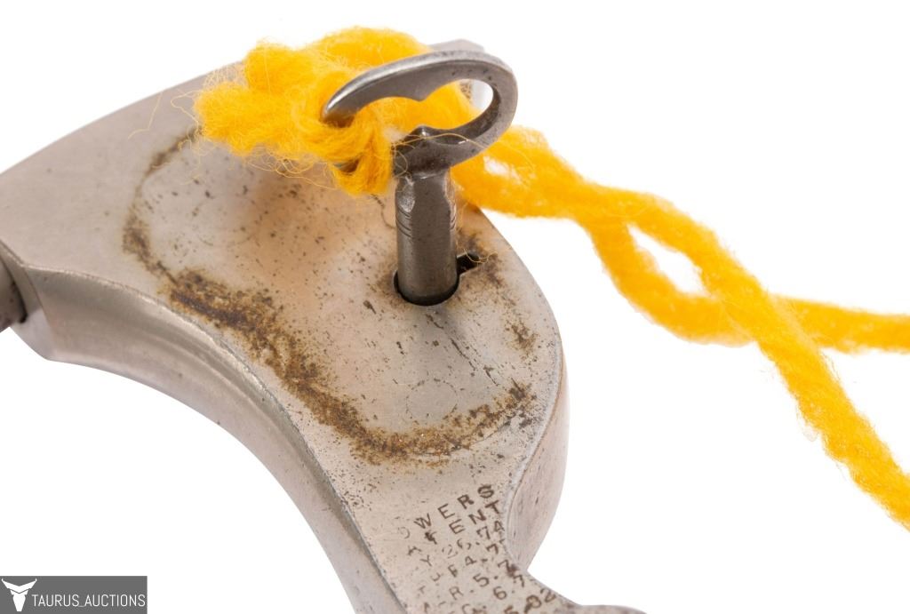 The handcuffs themselves are a fine example of Tower restraints (nickel finish, three-ring chain linkage, stamped “134,” last patent date 1882). Their true significance, however, lies in their provenance: they come directly from the estate of John Archipoli and are accompanied by a letter of authenticity from Taurus Auctions, verifying purchase from the Archipoli family.