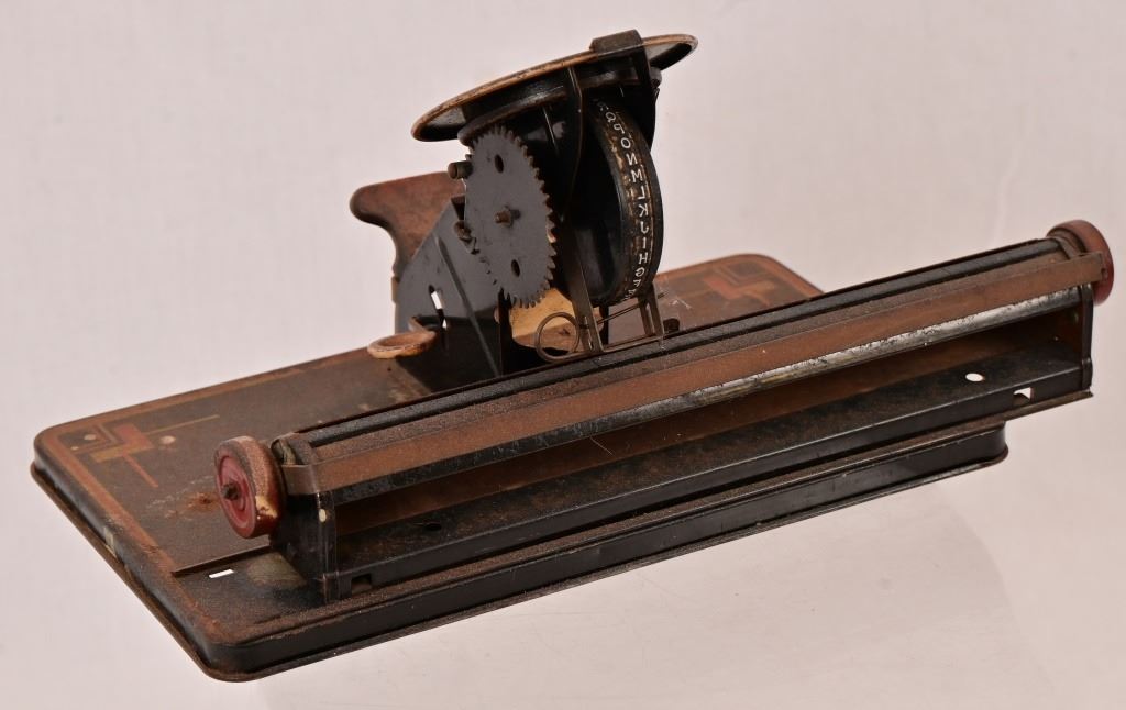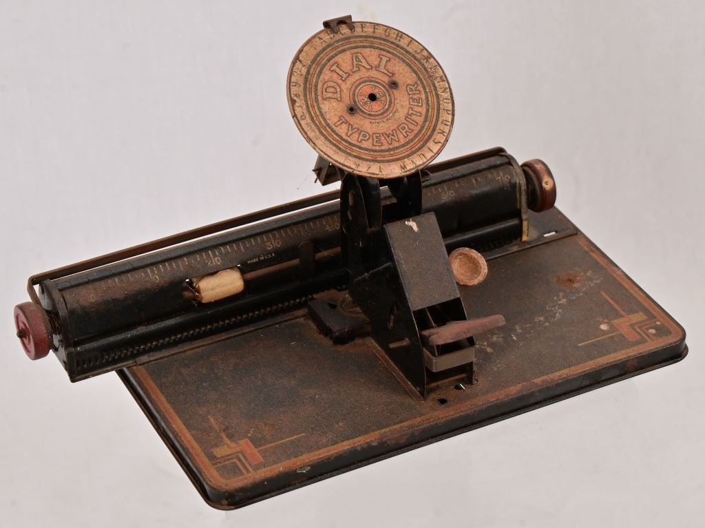 Vintage 1920s LOUIS MARX Original Tinplate Toy Dial Typewriter. Fair Condition. This item works and measures 6 1/4" T x 11" W x 5 3/4" D.