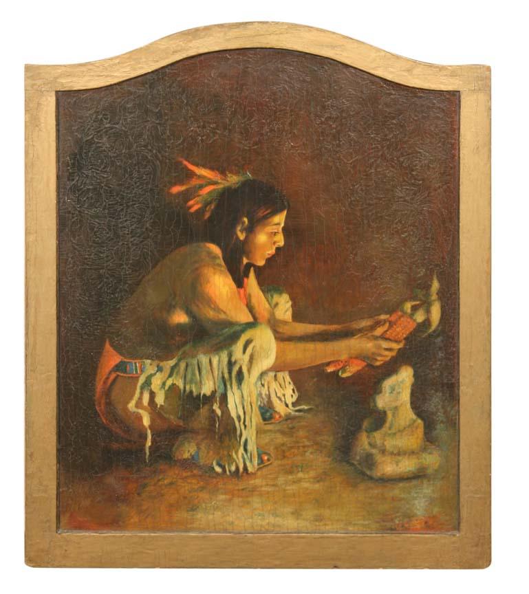 1920s Painted Panel. In the manor of Joseph Henry Sharp. 32" x 26" overall size. (est $600-900). Provenance: Ex-La Junta, Colorado Estate. For condition reports please visit: www.auctioninsantafe.com/cr2011.pdf