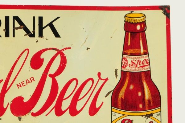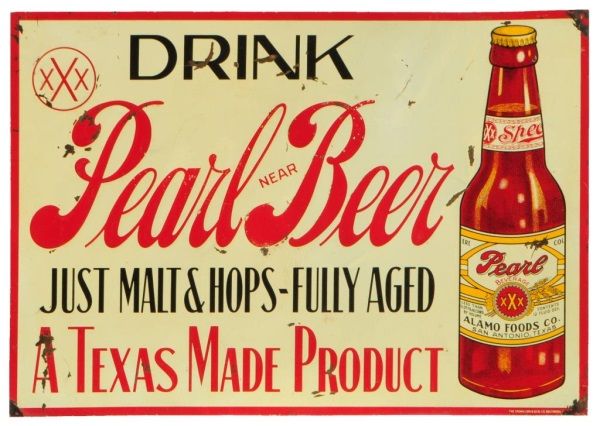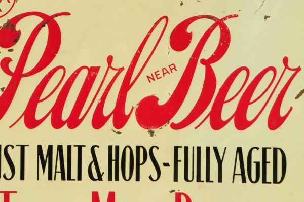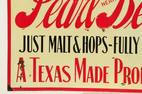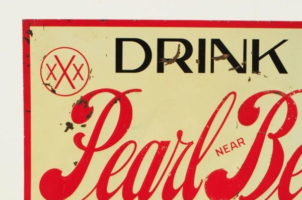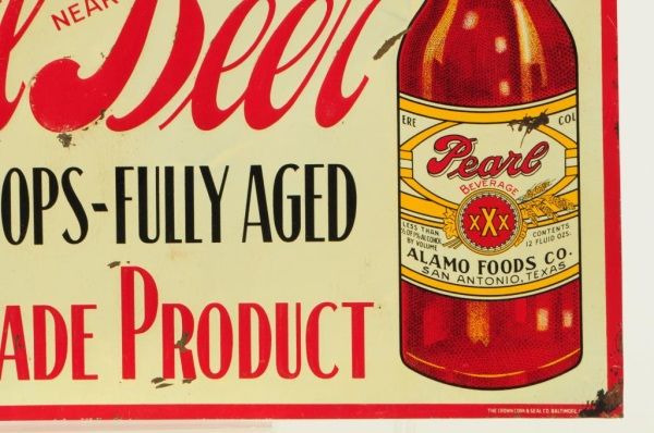 Pearl Near Beer Tin Prohibition Era Sign. A  Texas Made Product, Alamo Foods Co. San  Antonio, TX. Single sided. 19 3/4" x 14 3/4.