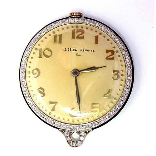 This elegant pendant watch was made for the prominent Boston jewelers Bigelow Kennard & Co. The face displays stylized platinum color numbers and hands on an off-white background. A row of diamonds set in platinum forming an intricate border. A black enamel edge separates the face from the back. The arch-shaped hanging loop is also encrusted with diamonds. Marked "3 PLATINUM 6" on the back. The movement is probably made by one of the best Swiss watchmakers C.H. Meylan of Brassus, Switzerland, are marked "BIGELOW KENNARD & CO. BOSTON", "SWISS", AND "ADJUSTED 10188". The 59 diamond total weight is approximately 1.75Ct It is in working condition, but it is being offered in, as is condition.