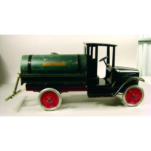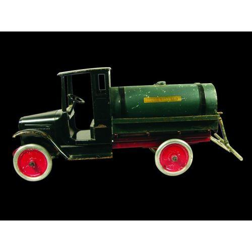 1920s Pressed Steel Buddy L Tanker with water sprinkler attachment. Original paint and decals. Includes original accessory rear street sprinkler bar. Good played with condition. 26 inches long.