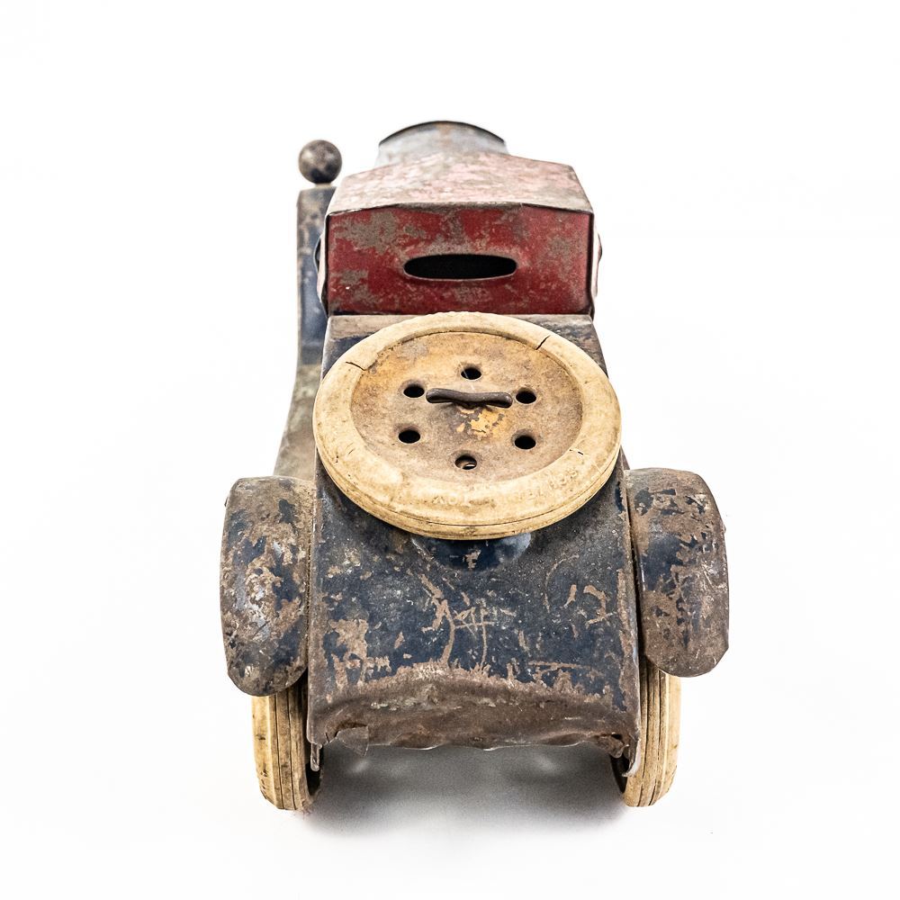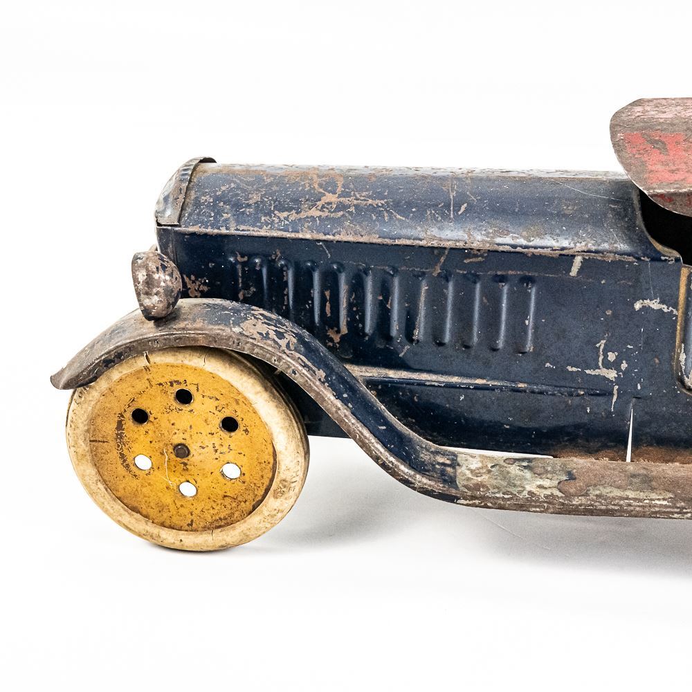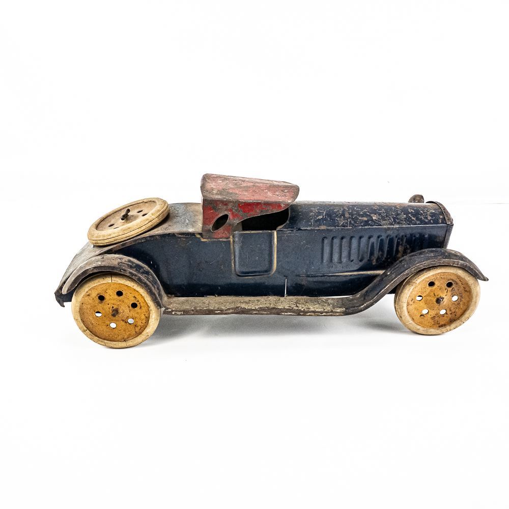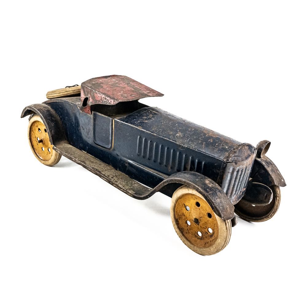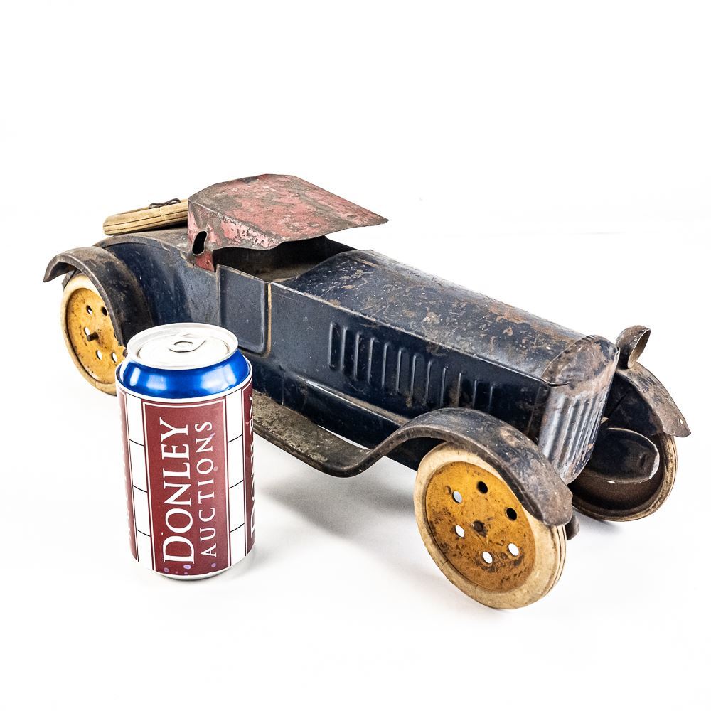 1920s 18" Schieble (Dayton Ohio) pressed steel toy friction coupe roadster. Good overall condition with age and wear including discoloration, scuffs, scratches & light rust. Wheels spin however the friction wind mechanism no longer works, white rubber wheels show cracks etc. Appears to be all original and a perfect restoration candidate. Perfect addition to your collection, please use photos to judge condition and bid accordingly.