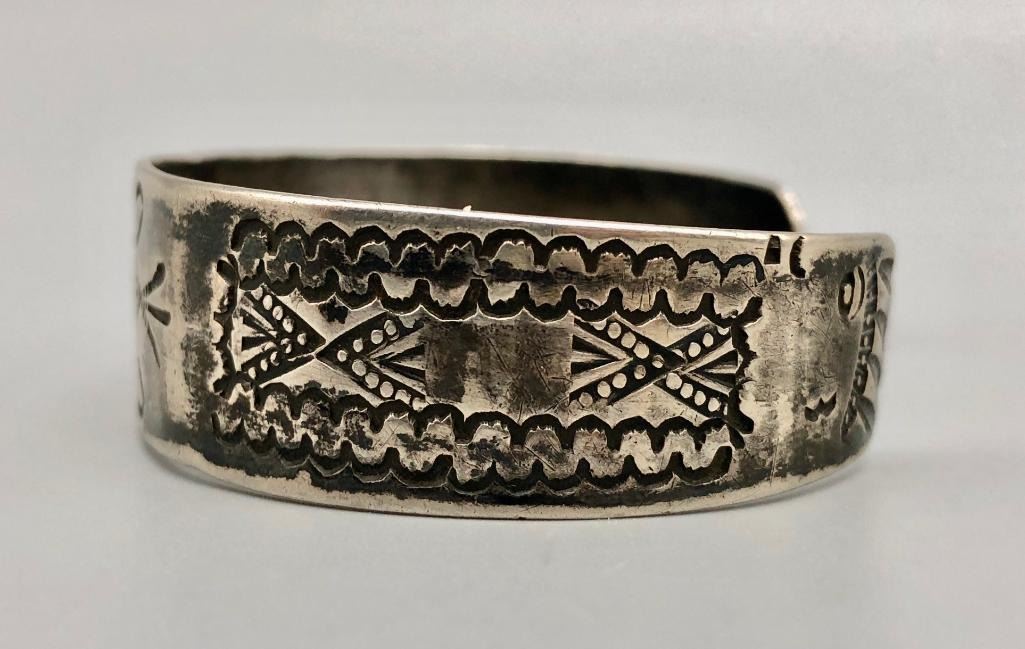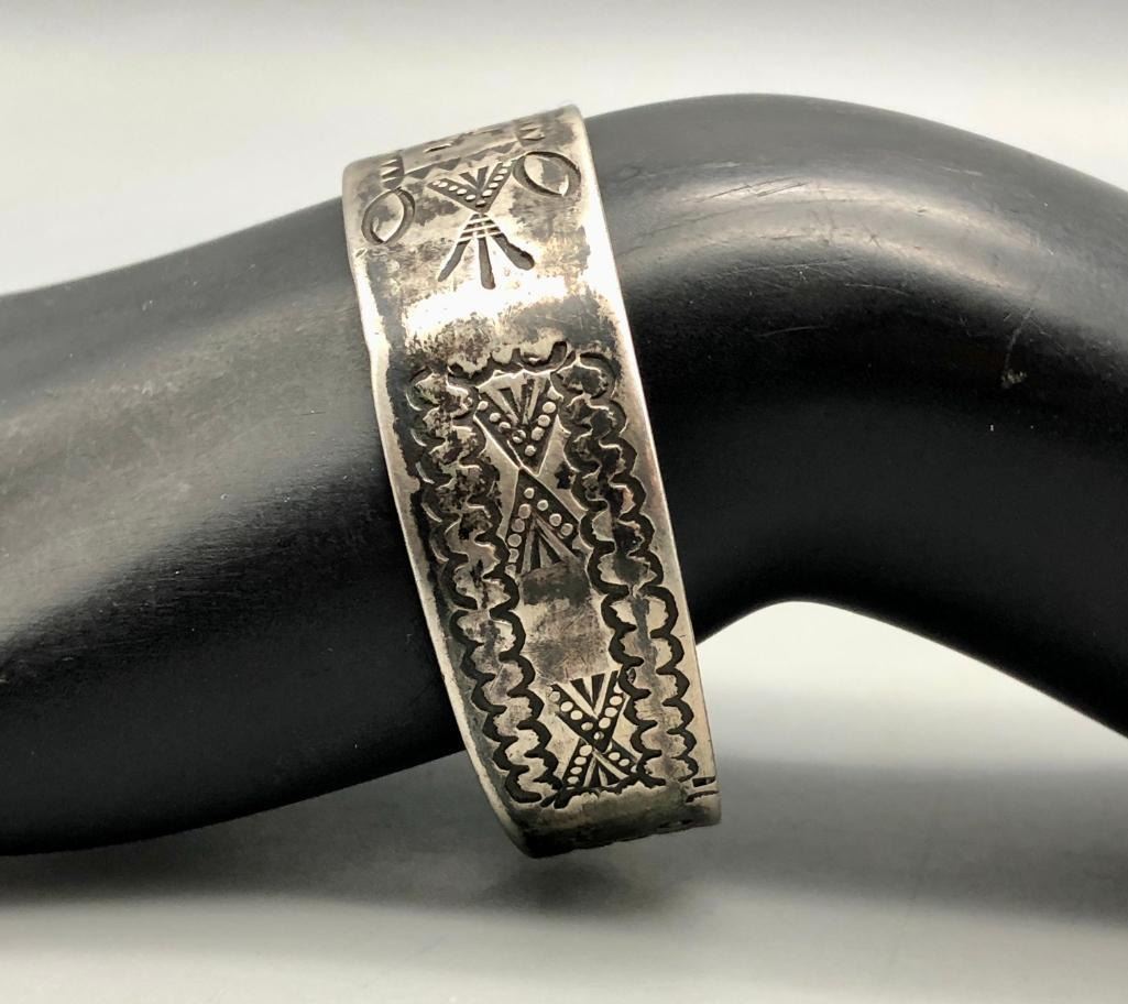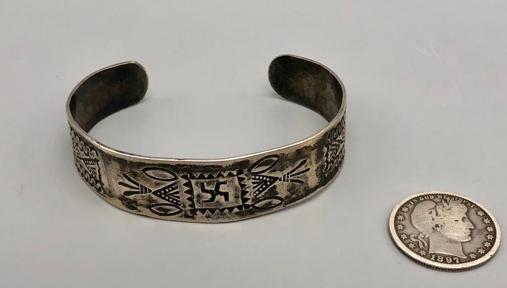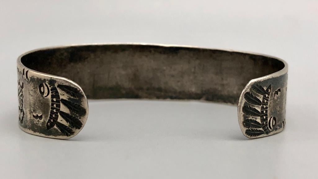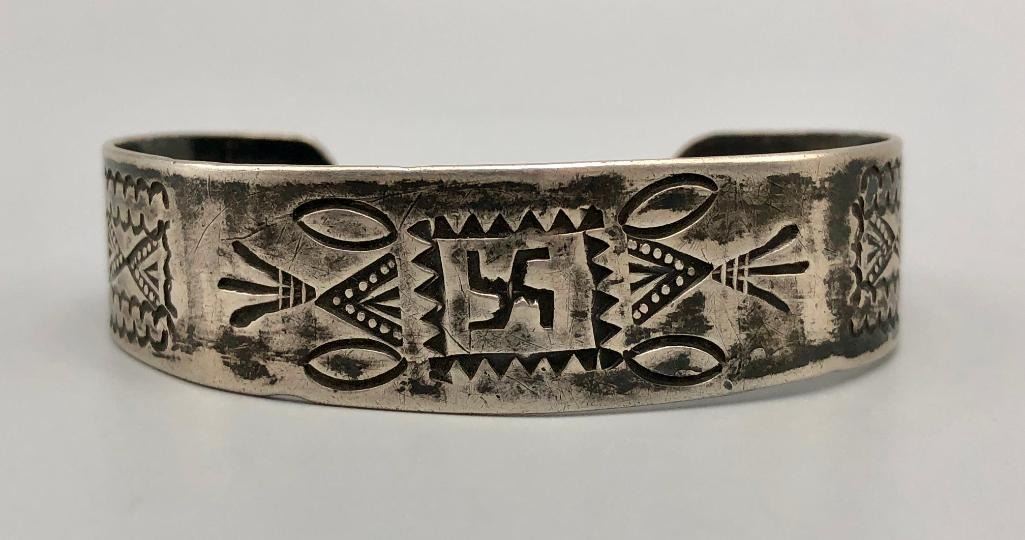 Up for consideration is a 1920s sterling silver bracelet with chief's and whirling logs. This is a great example of silverwork and craftsmanship from this era. It features a hand stamped rug design with a whirling log in the center and two chief profiles at the opening of the bracelet. It is made from sterling silver. MAKER: Unmarked. APPROX AGE: Circa 1920s. SIZE: Inside circumference measures 5-3/4 inched long. Opening is an additional 1-1/4 inches, fitting a 7 inch wrist. Width is 5/8 inches. Weighs 25.6 grams.  CONDITION: Good for its age, normal wear expected. Please look closely at the pictures as they are an important part of our description and are hereby incorporated into the description, specifically with regards to condition. SHIPPING: There will be a $5 handling / packaging fee for shipping this lot. The actual cost of postage will be added on top of that. BUY IT NOW: If you would like to buy this item now, without waiting for the auction day to bid on it, we do offer this option (which is available up to 48 hours before the actual auction starts). The “Buy it Now†price is the high estimate of this lot (plus applicable fees and the Buyer's premium is discounted to 10% when using the Buy it Now option). If you would like to exercise this option, you must contact us by email (or phone as long as you talk to someone live). Reference this lot number and your intention to "Buy it Now."