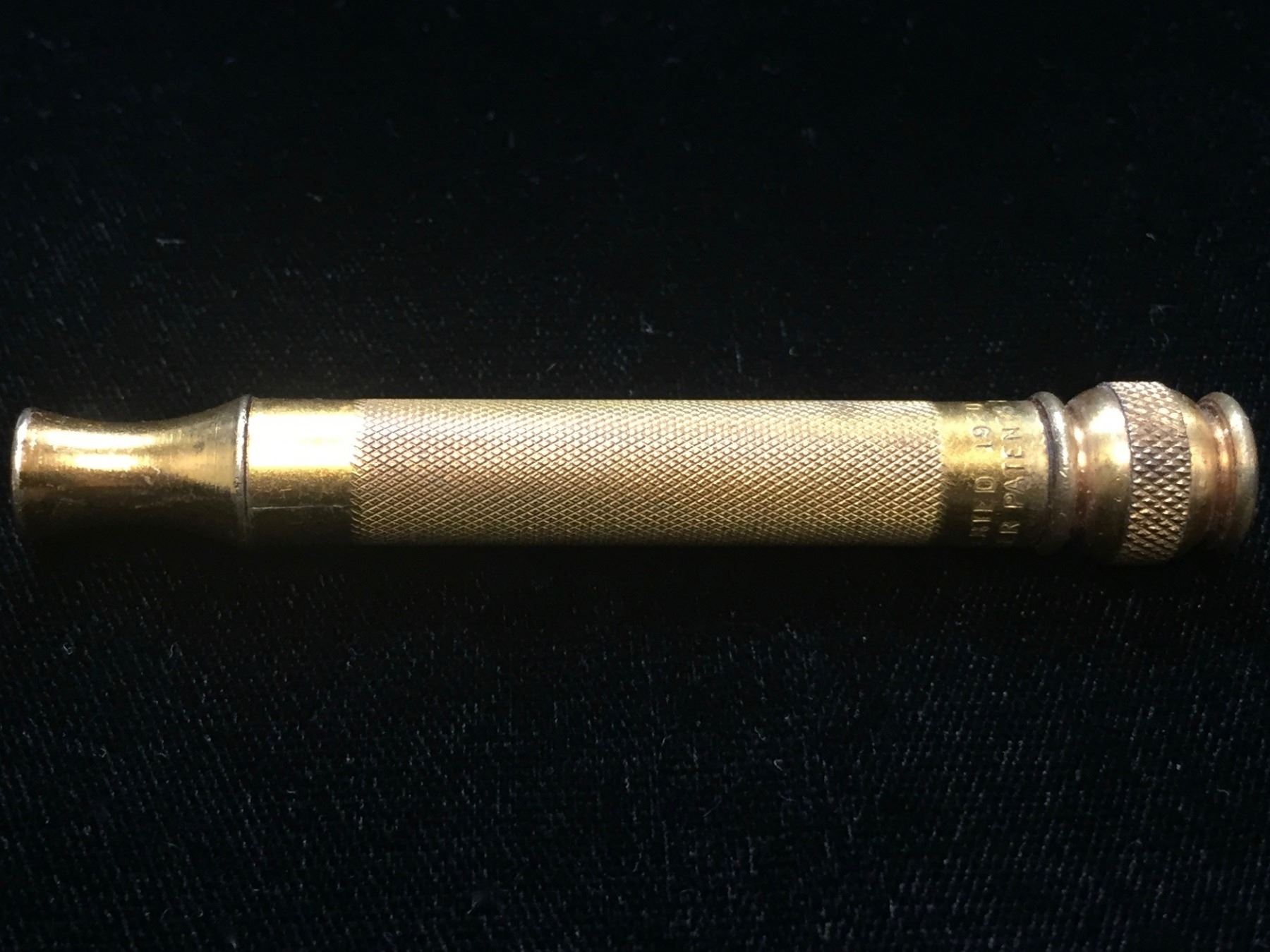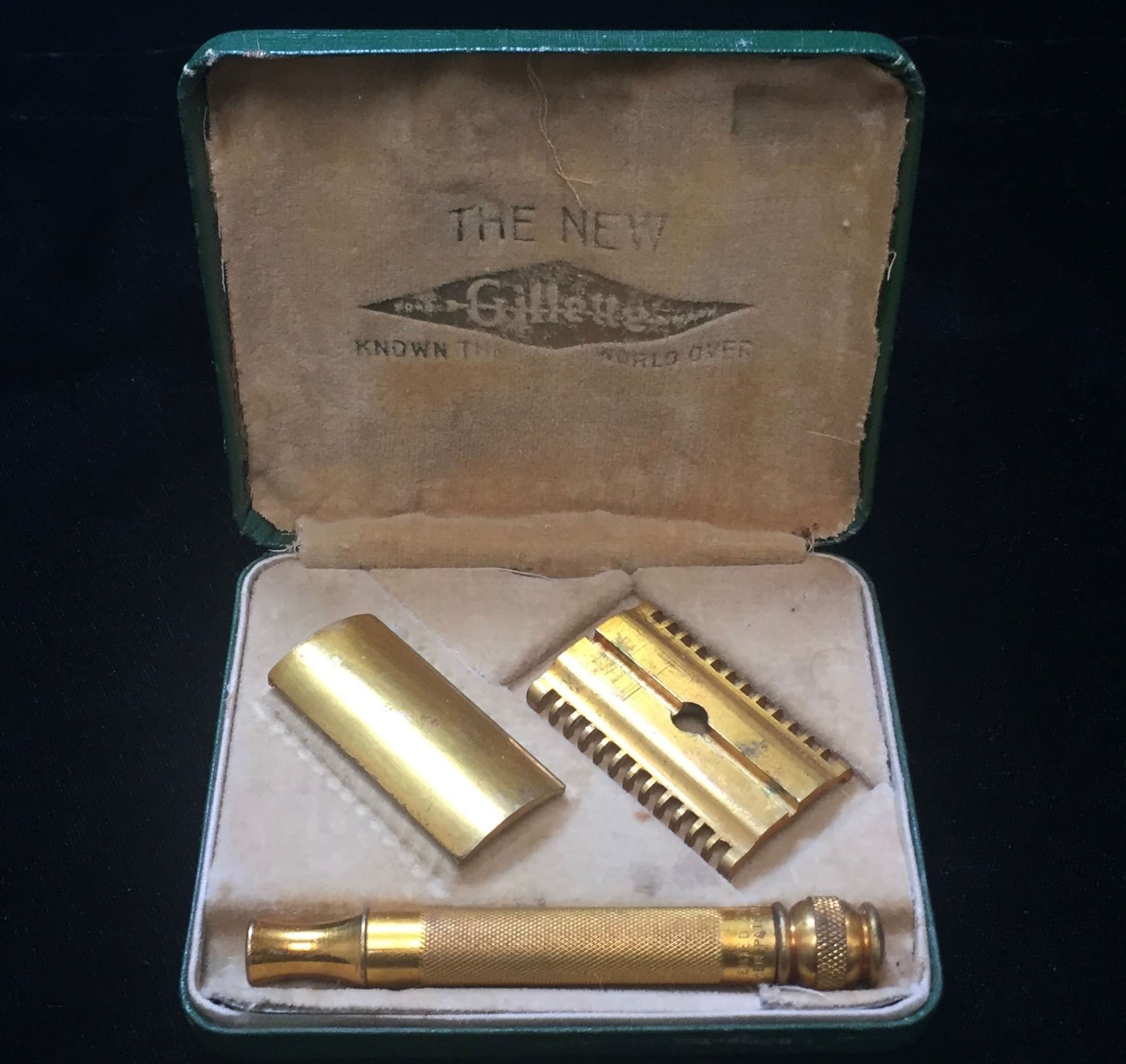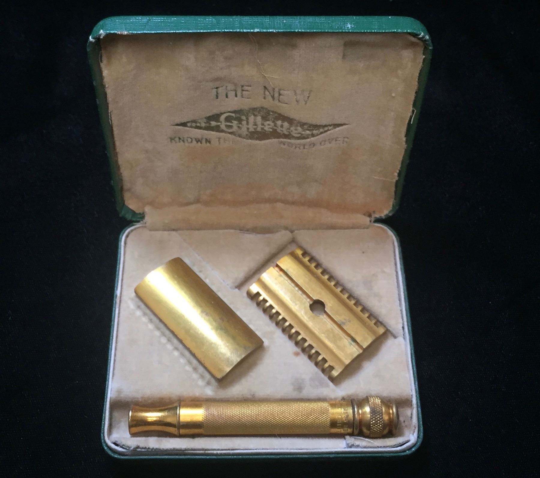 Lot 173; 1920s Vintage Gillette "The New" Razor Traveller Set, Razor and handle is made of brass and appears to be great condition (minor crack near the neck and near ball of handle) and this becomes common after wear and tightening. Top of the neck and ball at bottom of handle are in good condition. The top of the Razor screws nicely into handle and does have some apparent wear. Traveller Case is in good condition, closes and opens, and has some visible wear considering it is from the 1920s but otherwise is good condition. Inside is lined with felt for cushion packing