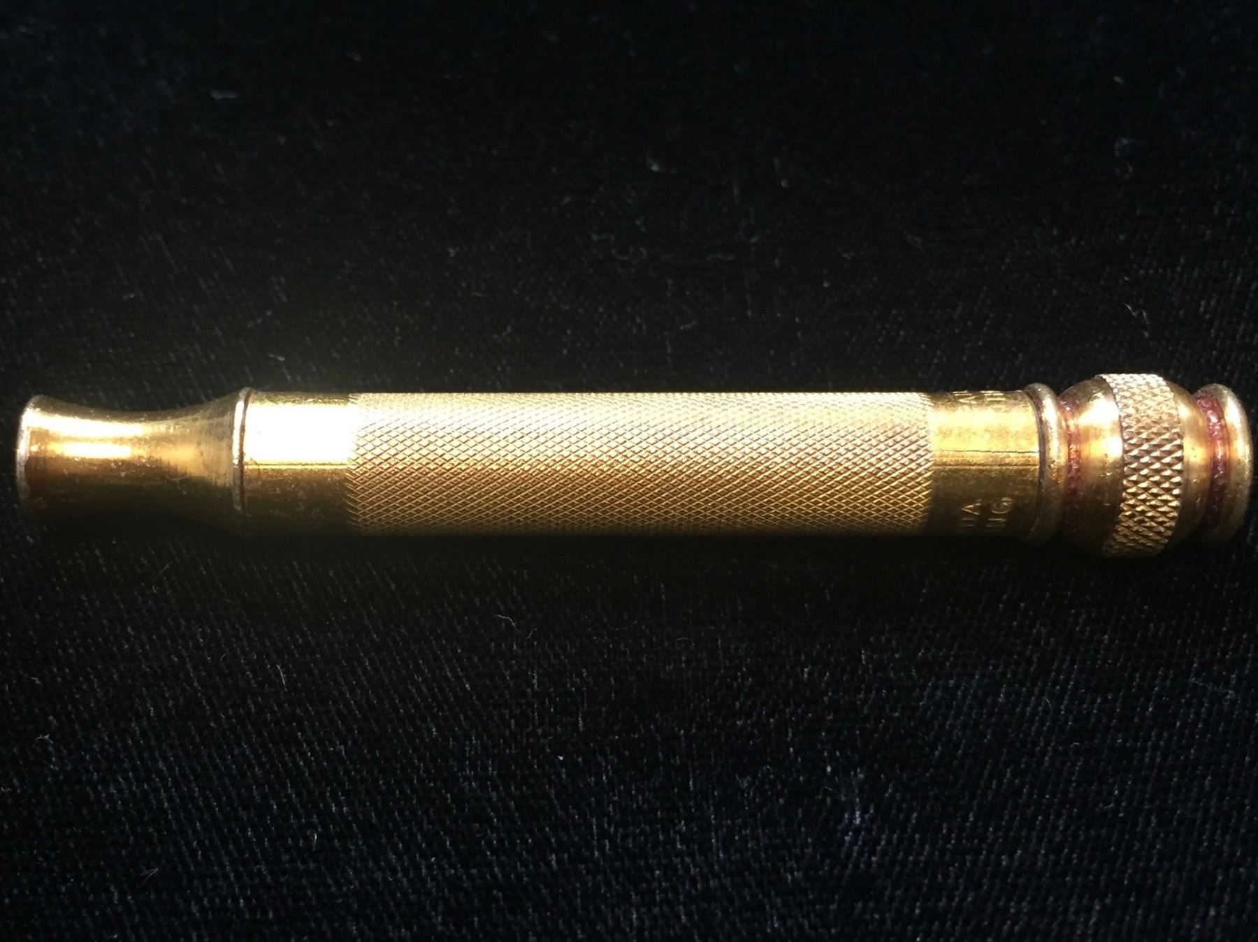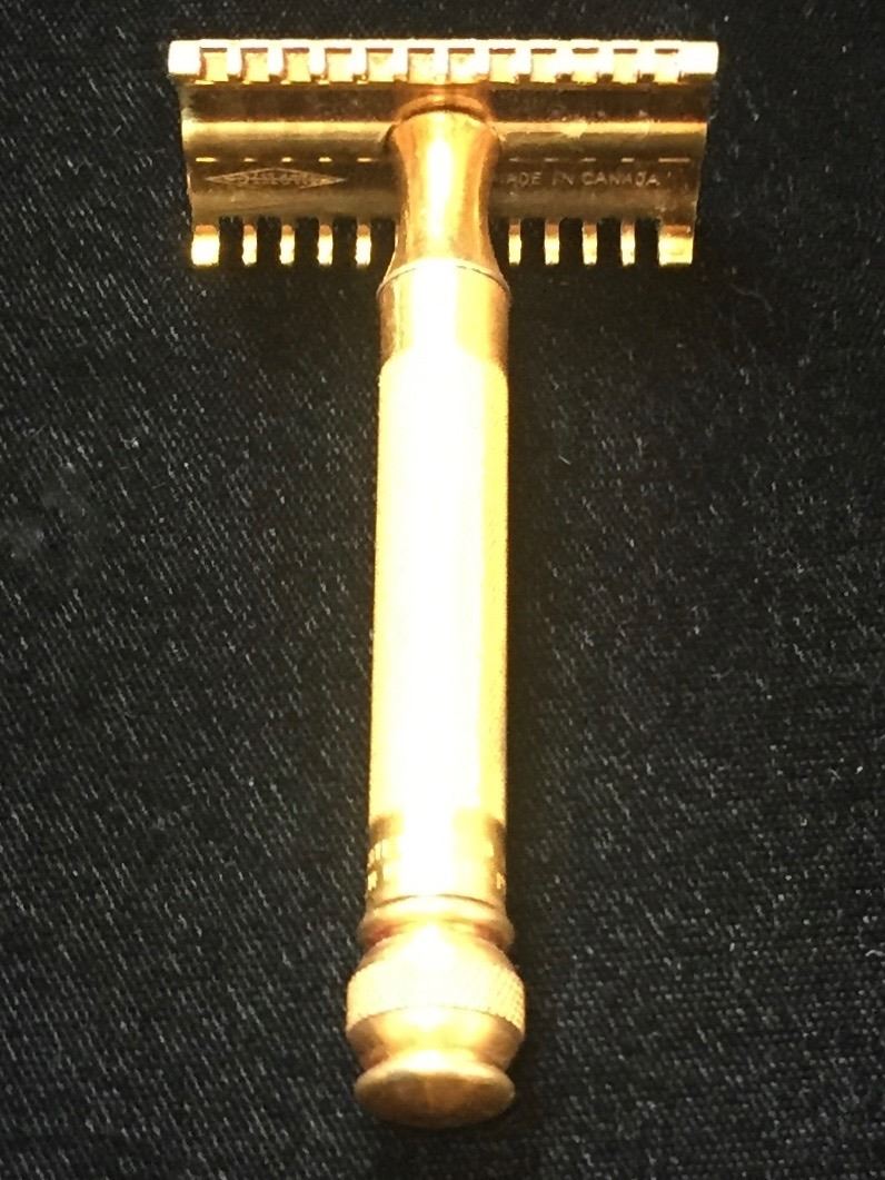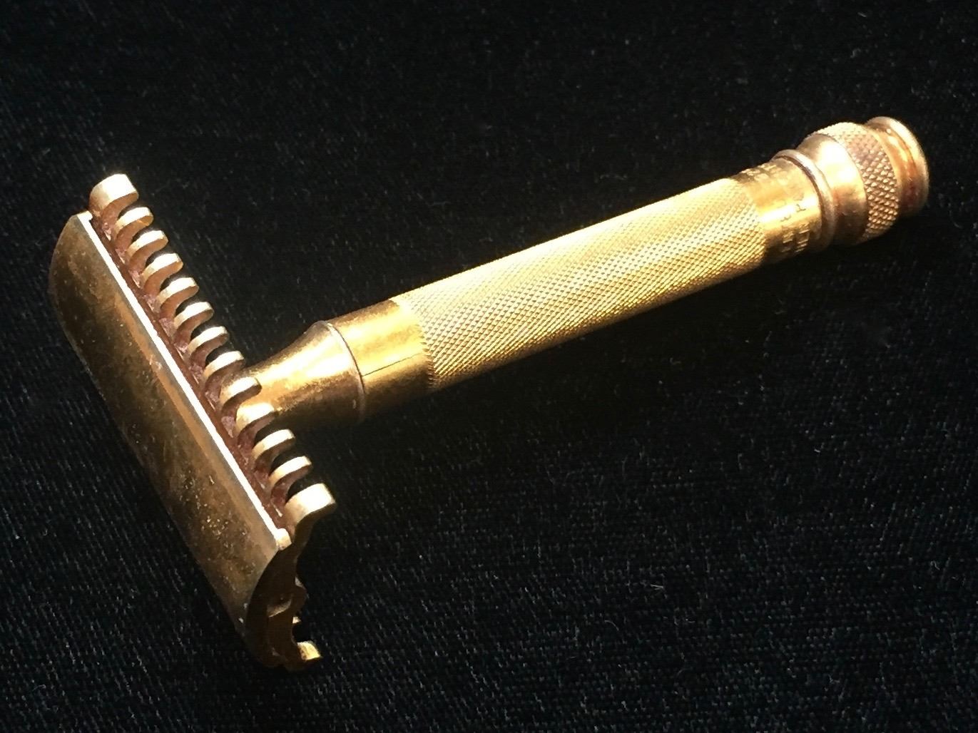 Lot 173; 1920s Vintage Gillette "The New" Razor Traveller Set, Razor and handle is made of brass and appears to be great condition (minor crack near the neck and near ball of handle) and this becomes common after wear and tightening. Top of the neck and ball at bottom of handle are in good condition. The top of the Razor screws nicely into handle and does have some apparent wear. Traveller Case is in good condition, closes and opens, and has some visible wear considering it is from the 1920s but otherwise is good condition. Inside is lined with felt for cushion packing