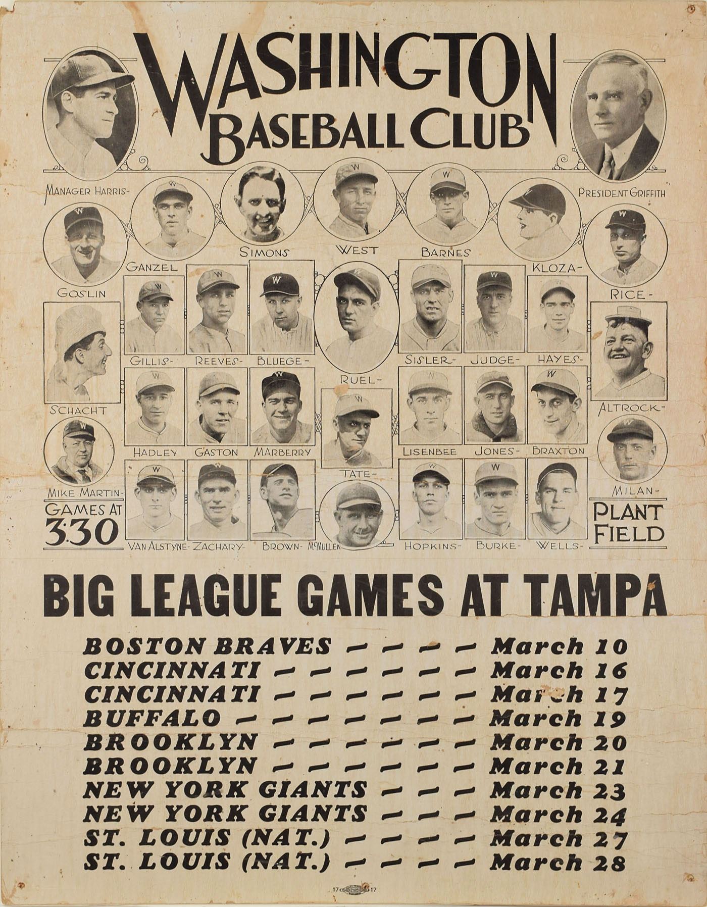 Fantastic circa late 1920s advertising poster, 22 x 28, featuring images of the Washington Senators roster and their spring training schedule for games to be played at Plant Field in Tampa. Among the notable names featured are Hall of Famers Bucky Harris, Goose Goslin, George Sisler, Sam Rice, and Clark Griffith. Mounted to a slightly larger foamcore backing. In very good condition, with creasing, staining, and nail holes at the corners.