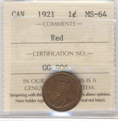 1921 1¢. A gem certified as ICCS MS64RD. A great example with a wine red appearance. A rare coin in this grade