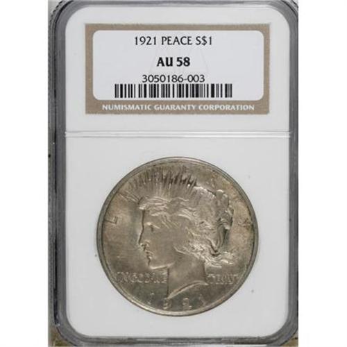 <B>1921 $1 AU58 NGC.</B></I> NGC Census: (567/7636). PCGS Population (816/9037). Mintage: 1,006,473. Numismedia Wsl. Price for NGC/PCGS coin in AU58: $170. (#7356)<BR><BR><B>Coin Engraver:</B> Anthony de Francisci<BR><BR><b>Shipping:</b> Coins & Currency (<a target="_blank" href="http://www.heritageauctions.com/common/shipping.php">view shipping information</a>)
