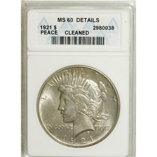 <B>1921 $1 --Cleaned--ANACS. MS60 Details.</B></I> NGC Census: (21/7202). PCGS Population (83/8406). Mintage: 1,006,473. Numismedia Wsl. Price for NGC/PCGS coin in MS60: $188. (#7356)<BR><BR><b>Shipping:</b> Coins & Currency (<a target="_blank" href="http://www.heritageauctions.com/common/shipping.php">view shipping information</a>)