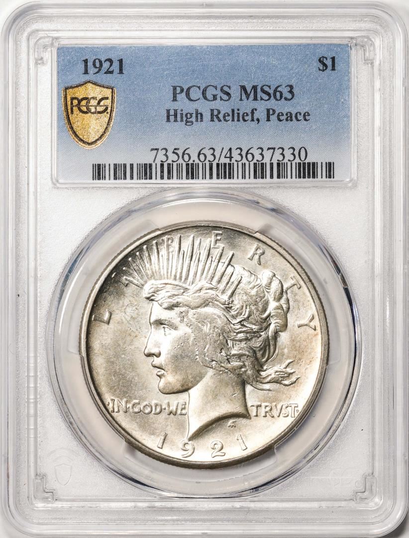 One 1921 $1 High Relief Peace Silver Dollar Coin PCGS MS63. PCGS Graded.