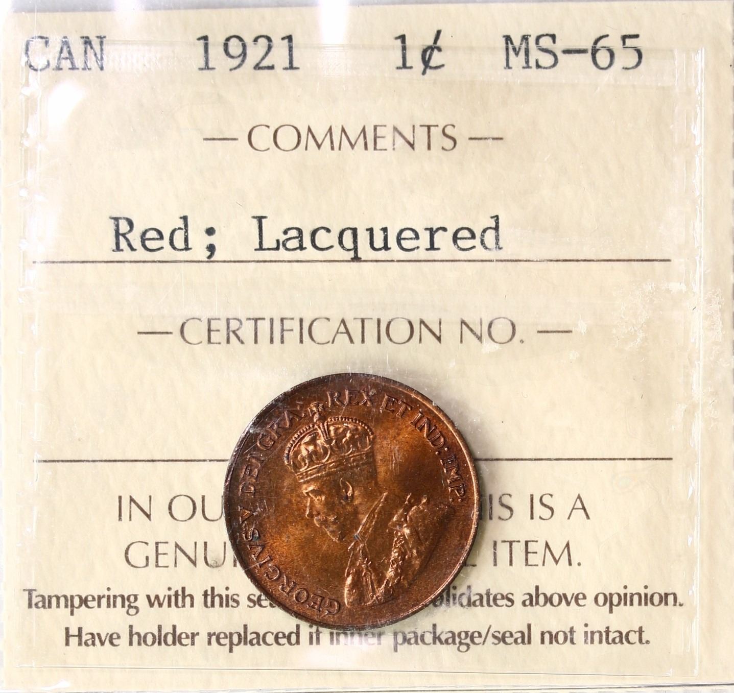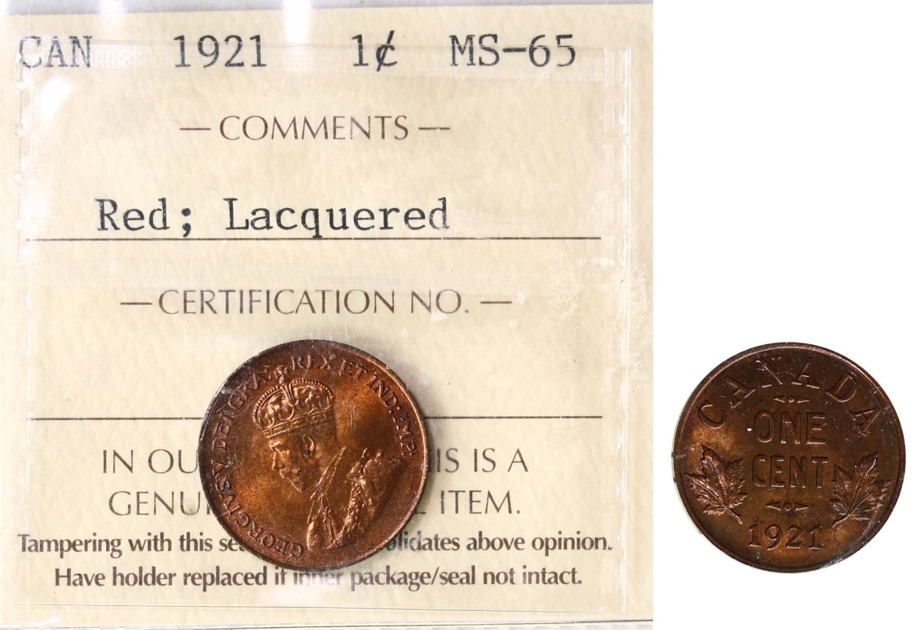 1921 1¢ ICCS Gem Mint State-65RD. Nice better date gem, 75% red issue designated as lacquered. A similar example sold for $7140 at the 2021 RCNA sale.