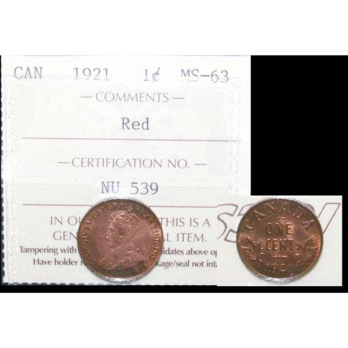 1921 1¢ ICCS MS-63 Red, rare date and underra