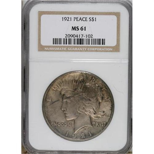 <B>1921 $1 MS61 NGC.</B></I> NGC Census: (292/6951). PCGS Population (226/8180). Mintage: 1,006,473. Numismedia Wsl. Price for NGC/PCGS coin in MS61: $192. (#7356)<BR><BR><b>Shipping:</b> Coins & Currency (<a target="_blank" href="http://www.heritageauctions.com/common/shipping.php">view shipping information</a>)