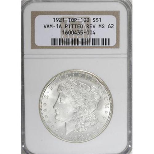 <B>1921 $1 MS62 NGC.</B></I> VAM-1A. Pitted Reverse. A Top 100 Variety. This is the plate coin in the Top 100 book written by Michael S. Fey, Ph. D. & Jeff Oxman. NGC Census: (1934/53344). PCGS Population (2649/38434). Mintage: 44,690,000. Numismedia Wsl. Price for NGC/PCGS coin in MS62: $23. (#7296)<BR><BR><b>Shipping:</b> Coins & Currency (<a target="_blank" href="http://www.heritageauctions.com/common/shipping.php">view shipping information</a>)