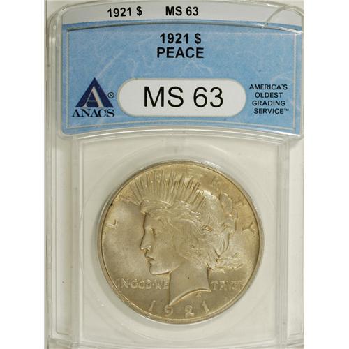 <B>1921 $1 MS63 ANACS.</B></I> NGC Census: (4016/7538). PCGS Population (2740/4002). Mintage: 1,006,473. Numismedia Wsl. Price for NGC/PCGS coin in MS63: $350. (#7356)<BR><BR><b>Shipping:</b> Coins & Currency (<a target="_blank" href="http://www.heritageauctions.com/common/shipping.php">view shipping information</a>)