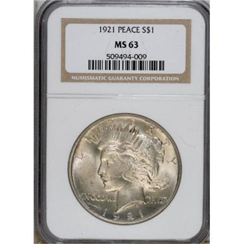 <B>1921 $1 MS63 NGC.</B></I> NGC Census: (2015/3784). PCGS Population (2739/3997). Mintage: 1,006,473. Numismedia Wsl. Price for NGC/PCGS coin in MS63: $420. (#7356)<BR><BR><b>Shipping:</b> Coins & Currency (<a target="_blank" href="http://www.heritageauctions.com/common/shipping.php">view shipping information</a>)