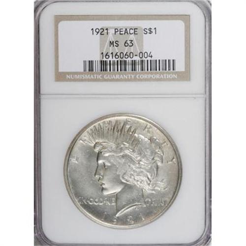 <B>1921 $1 MS63 NGC.</B></I> NGC Census: (2015/3784). PCGS Population (2739/3997). Mintage: 1,006,473. Numismedia Wsl. Price for NGC/PCGS coin in MS63: $420. (#7356)<BR><BR><b>Shipping:</b> Coins & Currency (<a target="_blank" href="http://www.heritageauctions.com/common/shipping.php">view shipping information</a>)