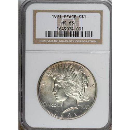 <B>1921 $1 MS63 NGC.</B></I> NGC Census: (2082/3877). PCGS Population (2805/4121). Mintage: 1,006,473. Numismedia Wsl. Price for NGC/PCGS coin in MS63: $420. (#7356)<BR><BR><B>Coin Engraver:</B> Anthony de Francisci<BR><BR><b>Shipping:</b> Coins & Currency (<a target="_blank" href="http://www.heritageauctions.com/common/shipping.php">view shipping information</a>)