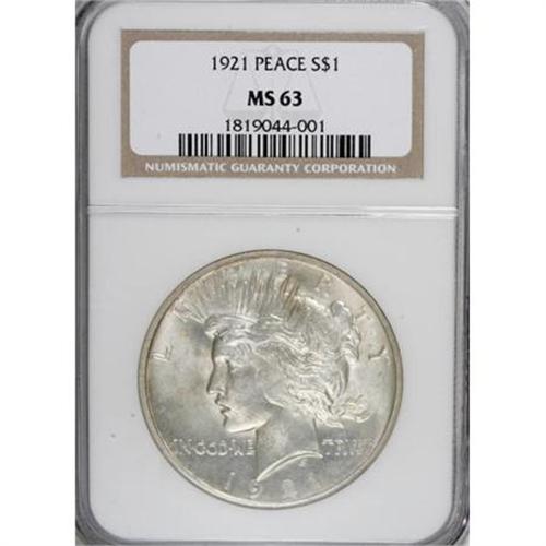 <B>1921 $1 MS63 NGC.</B></I> NGC Census: (2082/3877). PCGS Population (2805/4121). Mintage: 1,006,473. Numismedia Wsl. Price for NGC/PCGS coin in MS63: $420. (#7356)<BR><BR><B>Coin Engraver:</B> Anthony de Francisci<BR><BR><b>Shipping:</b> Coins & Currency (<a target="_blank" href="http://www.heritageauctions.com/common/shipping.php">view shipping information</a>)