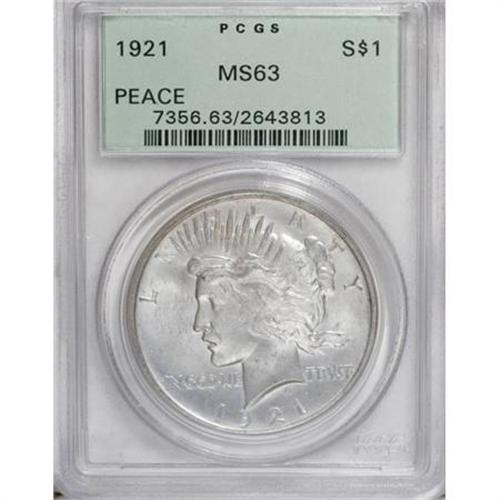 <B>1921 $1 MS63 PCGS.</B></I> . PCGS Population (2844/4316). NGC Census: (2145/3946). Mintage: 1,006,473. Numismedia Wsl. Price for NGC/PCGS coin in MS63: $430. (#7356)<BR><BR><B>Coin Engraver:</B> Anthony de Francisci<BR><BR><b>Shipping:</b> Coins & Currency (<a target="_blank" href="http://www.heritageauctions.com/common/shipping.php">view shipping information</a>)