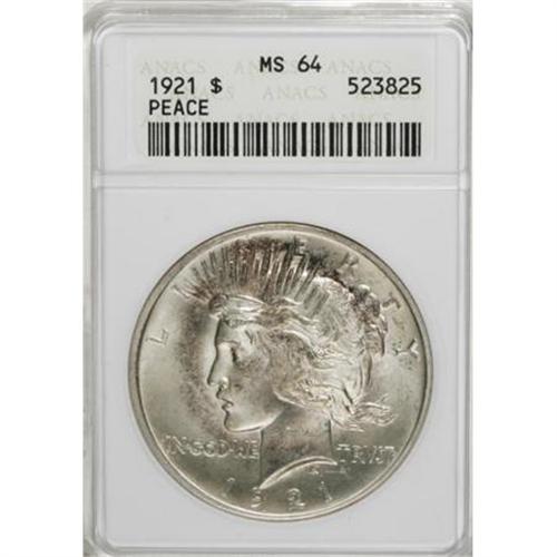 <B>1921 $1 MS64 ANACS.</B></I> Splashes of pastel rose and blue toning enhance the above average design definition and brilliant silver luster of this key-date Peace dollar.<BR><BR><B>Coin Engraver:</B> Anthony de Francisci<BR><BR><b>Shipping:</b> Coins & Currency (<a target="_blank" href="http://www.heritageauctions.com/common/shipping.php">view shipping information</a>)