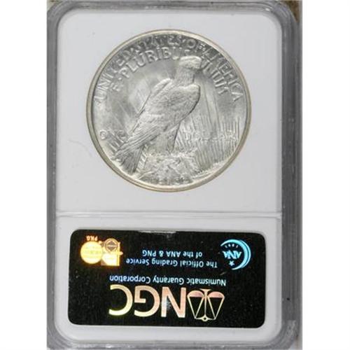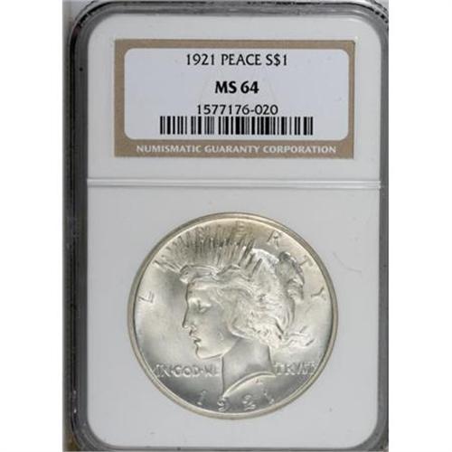 <B>1921 $1 MS64 NGC.</B></I> The 1921 Peace dollar, first in the series, is always popular for its special high relief, reminiscent of the earlier High Relief double eagles. Both sides have highly lustrous mint frost with brilliant silver surfaces. Slight central weakness is typical of nearly every known example.<BR><BR><B>Coin Engraver:</B> Anthony de Francisci<BR><BR><b>Shipping:</b> Coins & Currency (<a target="_blank" href="http://www.heritageauctions.com/common/shipping.php">view shipping information</a>)