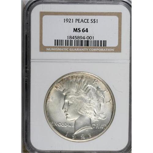 <B>1921 $1 MS64 NGC.</B></I> A well struck and lovely near-Gem representative of this prized first-year issue, strongly lustrous with hints of violet patina at the periphery. The well-preserved surfaces are essentially untoned otherwise.<BR><BR><B>Coin Engraver:</B> Anthony de Francisci<BR><BR><b>Shipping:</b> Coins & Currency (<a target="_blank" href="http://www.heritageauctions.com/common/shipping.php">view shipping information</a>)