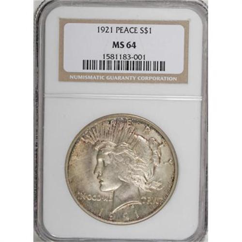 <B>1921 $1 MS64 NGC.</B></I> Softly lustrous and well-defined aside from the usual softness in the centers. Dappled tan and claret peripheral toning contrasts with the even cream-silver tint that prevails elsewhere on the surfaces. Minimally marked for the grade and appealing.<BR><BR><B>Coin Engraver:</B> Anthony de Francisci<BR><BR><b>Shipping:</b> Coins & Currency (<a target="_blank" href="http://www.heritageauctions.com/common/shipping.php">view shipping information</a>)