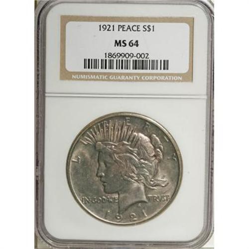 <B>1921 $1 MS64 NGC.</B></I> Medium autumn-brown and plum-mauve toning embraces this satiny and impressively unabraded near-Gem. The centers have above average yet incomplete definition.<BR><BR><B>Coin Engraver:</B> Anthony de Francisci<BR><BR><b>Shipping:</b> Coins & Currency (<a target="_blank" href="http://www.heritageauctions.com/common/shipping.php">view shipping information</a>)
