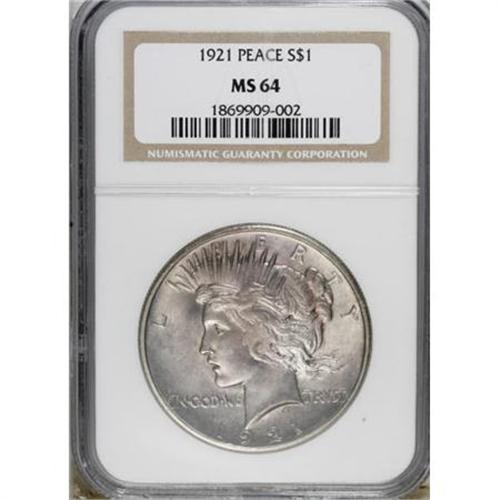 <B>1921 $1 MS64 NGC.</B></I> . NGC Census: (2917/1026). PCGS Population (3119/1197). Mintage: 1,006,473. Numismedia Wsl. Price for NGC/PCGS coin in MS64: $715. (#7356)<BR><BR><B>Coin Engraver:</B> Anthony de Francisci<BR><BR><b>Shipping:</b> Coins & Currency (<a target="_blank" href="http://www.heritageauctions.com/common/shipping.php">view shipping information</a>)