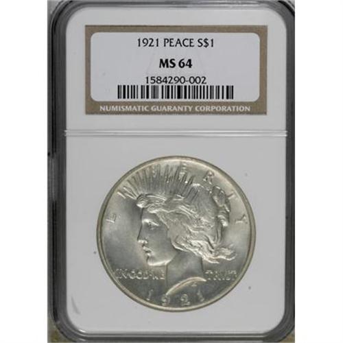 <B>1921 $1 MS64 NGC.</B></I> NGC Census: (2920/1029). PCGS Population (3159/1212). Mintage: 1,006,473. Numismedia Wsl. Price for NGC/PCGS coin in MS64: $715. (#7356)<BR><BR><B>Coin Engraver:</B> Anthony de Francisci<BR><BR><b>Shipping:</b> Coins & Currency (<a target="_blank" href="http://www.heritageauctions.com/common/shipping.php">view shipping information</a>)