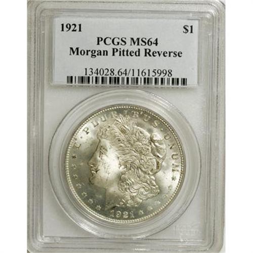 <B>1921 $1 MS64 PCGS.</B></I> Morgan Pitted Reverse. PCGS Population (11/10). NGC Census: (0/0). (#134028)<BR><BR><b>Shipping:</b> Coins & Currency (<a target="_blank" href="http://www.heritageauctions.com/common/shipping.php">view shipping information</a>)