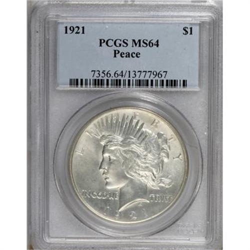 <B>1921 $1 MS64 PCGS.</B></I> The debut issue for the Peace dollar consisted of just over a million high-relief pieces. This silver-gray near-Gem displays strong luster and pleasing overall detail, though the central highpoints show a measure of softness as almost always. A great choice for the type or date collector.<BR><BR><B>Coin Engraver:</B> Anthony de Francisci<BR><BR><b>Shipping:</b> Coins & Currency (<a target="_blank" href="http://www.heritageauctions.com/common/shipping.php">view shipping information</a>)